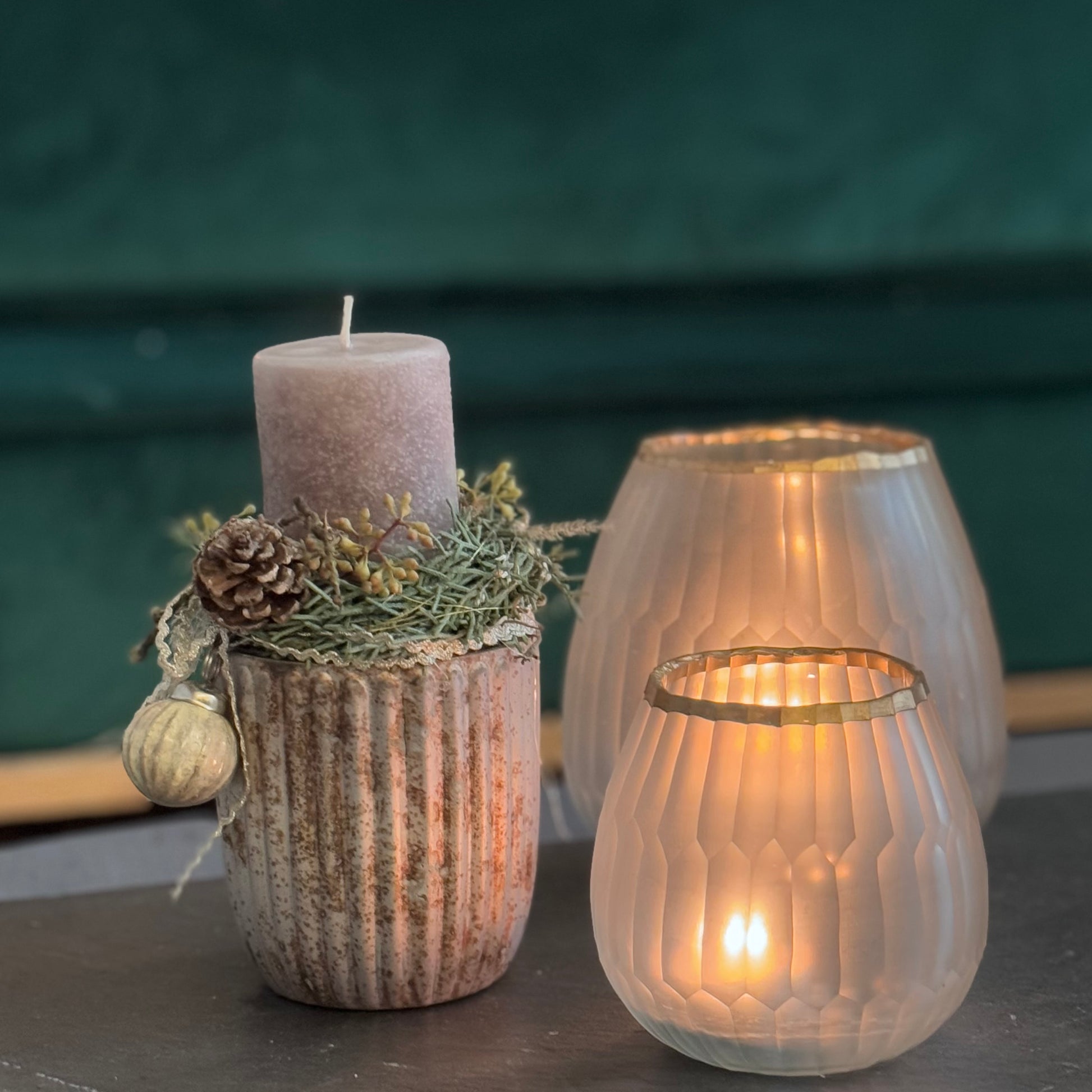 Ein kleines Windlicht mit Kerze und Grünzweigen weihnachtlich dekoriert