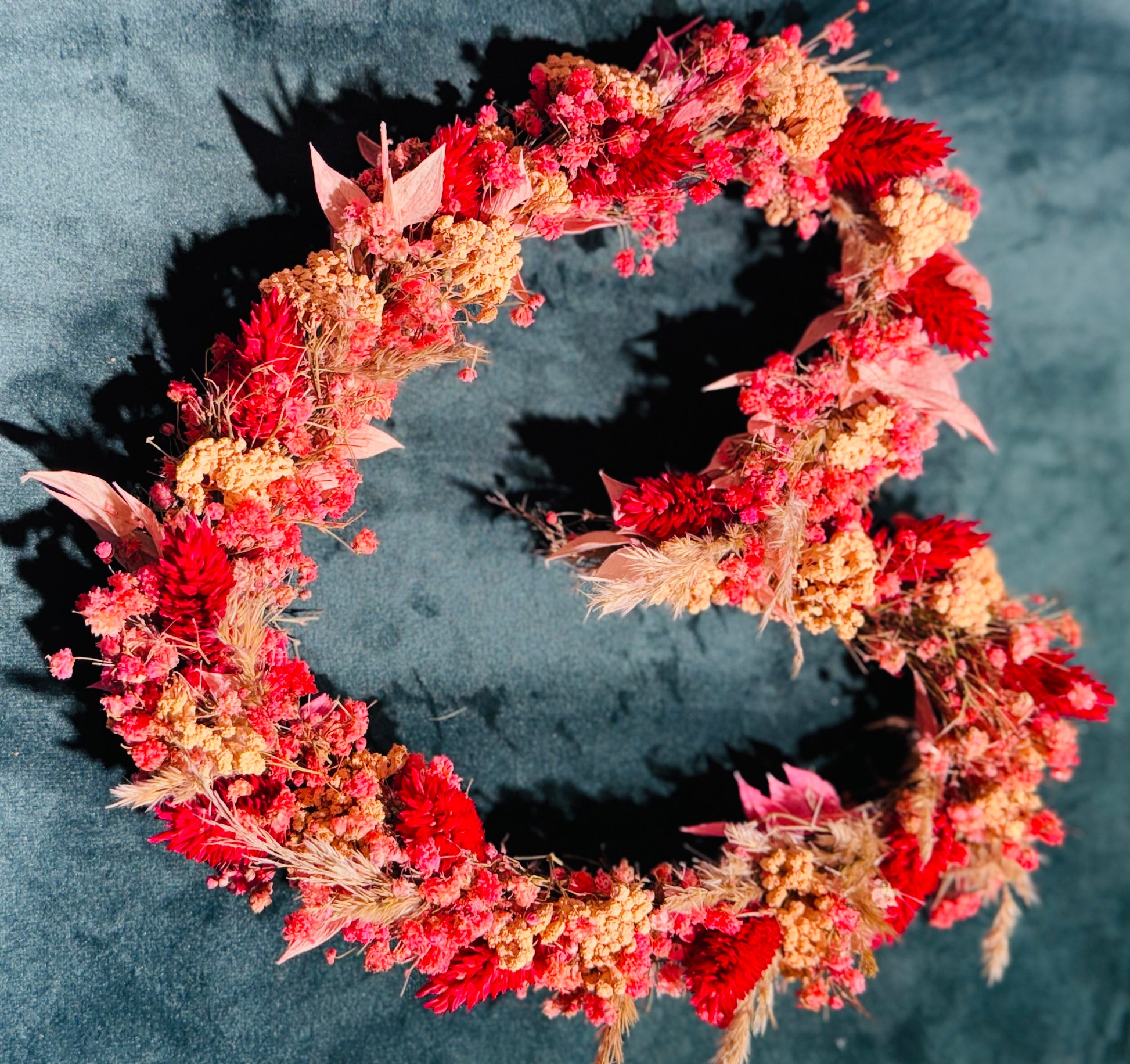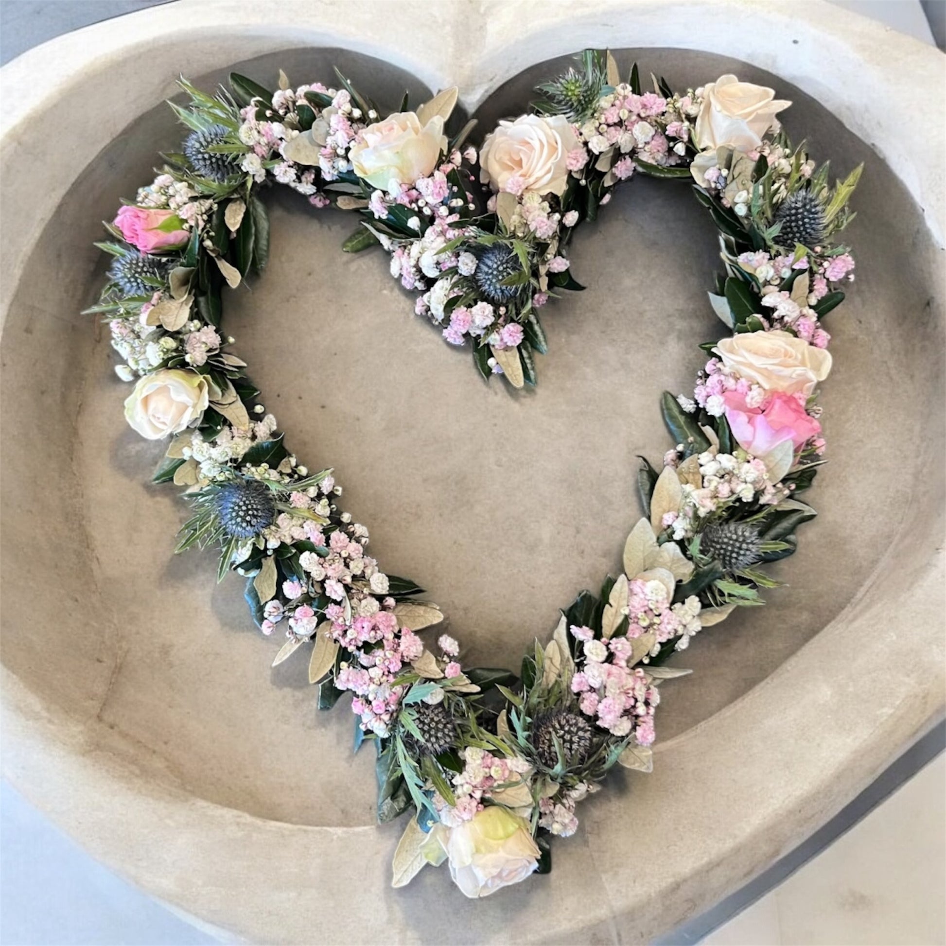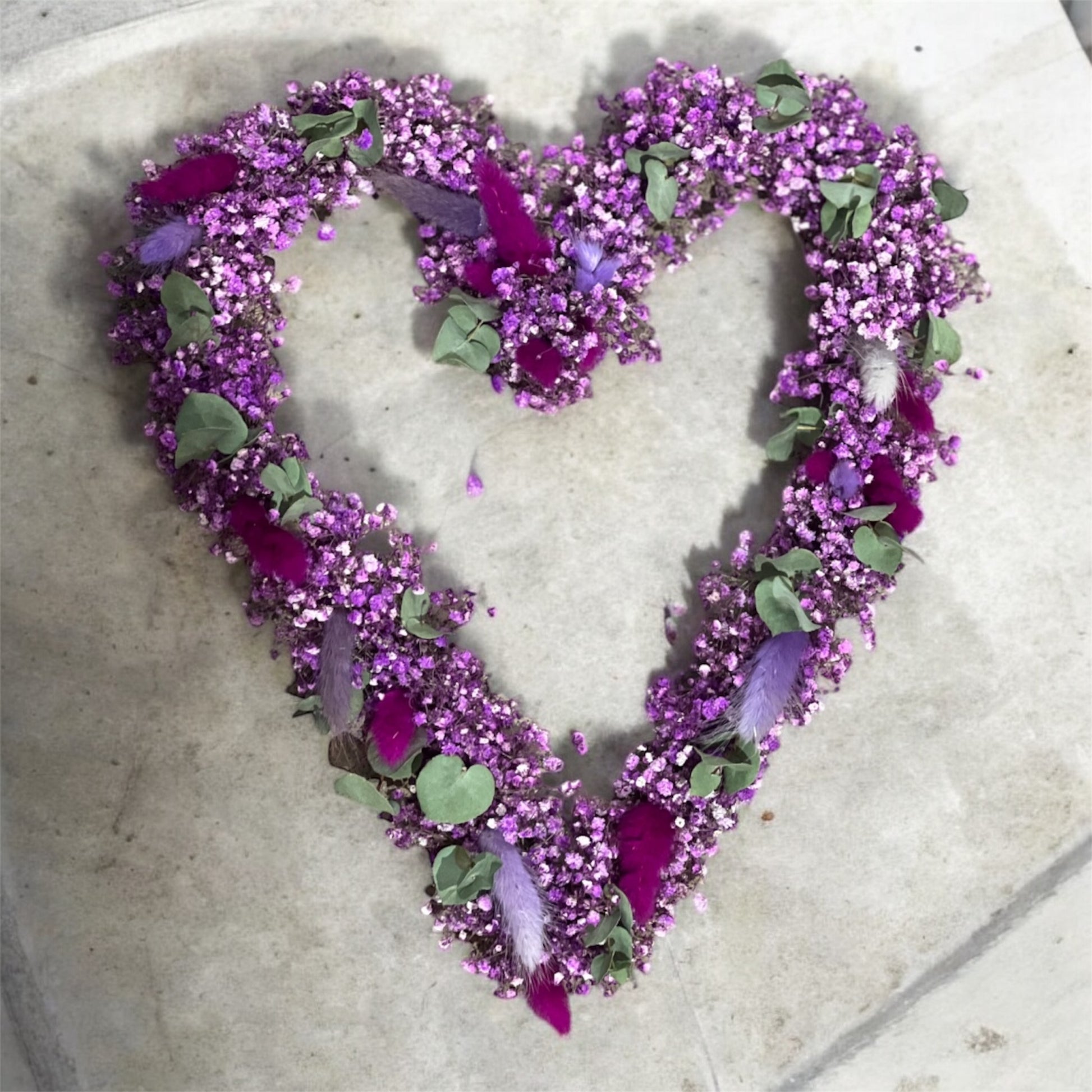 Ein wunderschönes, handgebundenes Herz aus verschiedenen Trockenblumen, harmonisch abgestimmt in einem perfekten Farbenspiel. Dieses florale Kunstwerk bleibt ca. 1 Jahr lang in voller Pracht erhalten und bringt üBerg lange Zeit hinweg natürliche Schönheit in Ihr Zuhause.