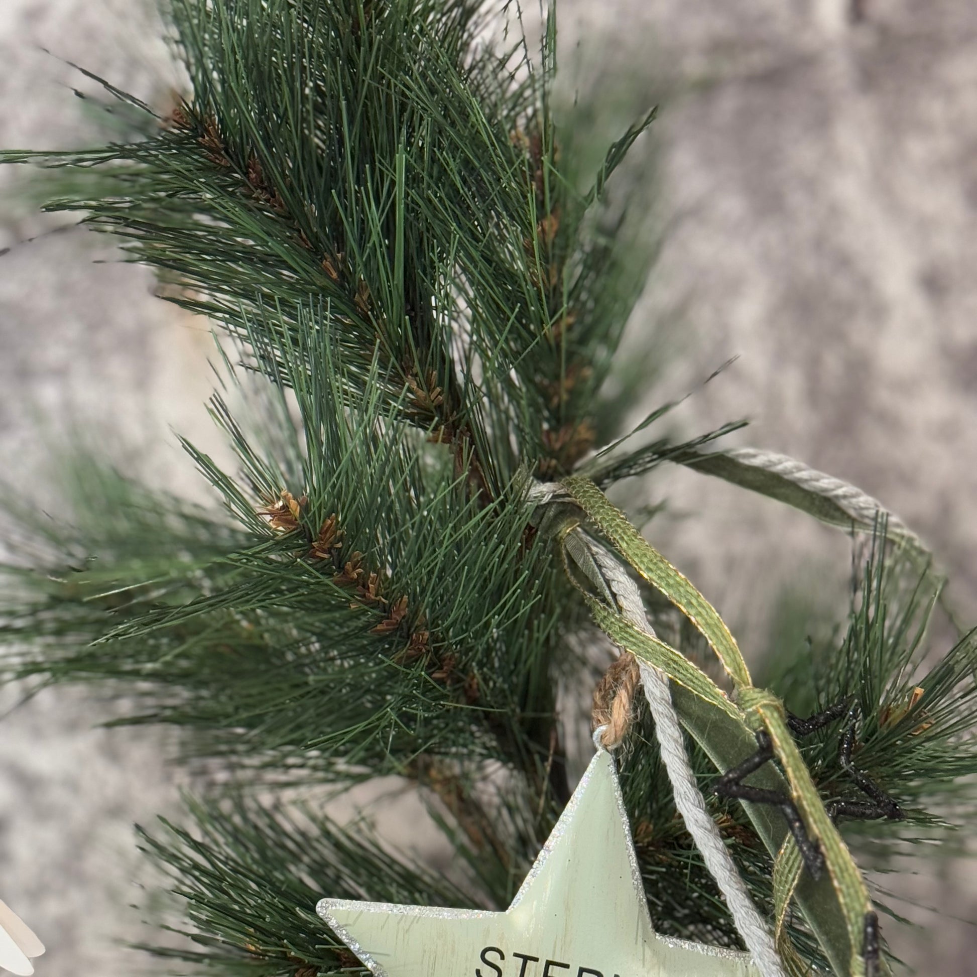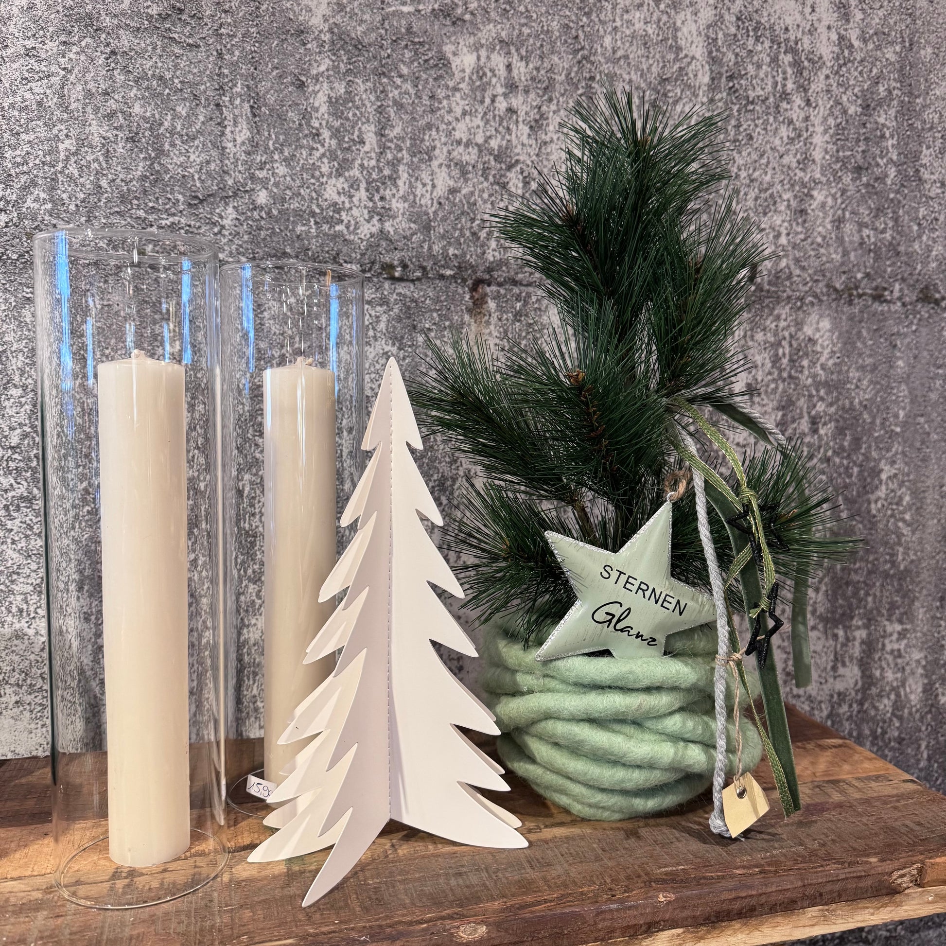 Ein kleines Bäumchen mit Filzschnüre umwickelt, mit Bäder und Sterne geschmückt!